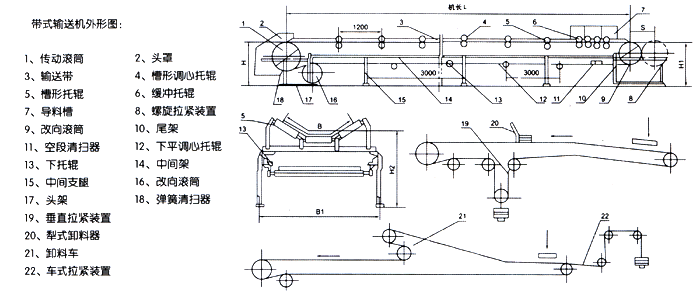 注:以上功率估算的工作條件為正常溫度,水平帶速1m/s,物料容量11/m3,動堆積角30度,一個空段清掃器,一個彈簧清當器和一個導料槽并考慮加速阻力因素。每個犁式卸料器所需功率約為:B500:0.3KW;B650:0.35KW;B800:0.45KW。