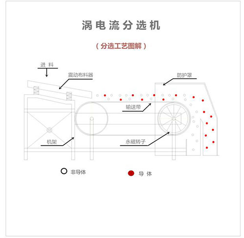 渦電流分選機(jī)(Eddy-Current Separation,ECS)是利用物質(zhì)導(dǎo)電性不同的一種分選技術(shù),其分選原理是利用磁石組成的磁石轉(zhuǎn)子,轉(zhuǎn)子在高速旋轉(zhuǎn)中會(huì)產(chǎn)生一個(gè)具有交替變化的磁場(chǎng)。當(dāng)具有電導(dǎo)性能的金屬經(jīng)過(guò)磁場(chǎng)時(shí),會(huì)在金屬內(nèi)感應(yīng)出渦電流。此渦電流本身會(huì)產(chǎn)生交替變換的磁場(chǎng)并與磁石轉(zhuǎn)子轉(zhuǎn)動(dòng)所產(chǎn)生的磁場(chǎng)相反,有色金屬(銅、鋁、鋅、錫)則會(huì)因相斥作用而沿其輸送方向跳出來(lái);實(shí)現(xiàn)與玻璃、塑料等非金屬物質(zhì)分離,達(dá)到分選目的。